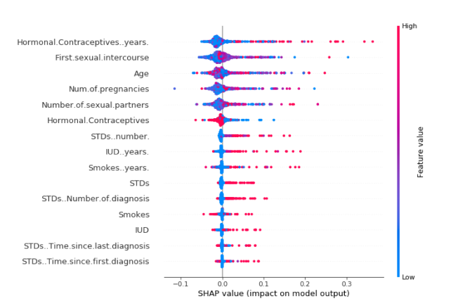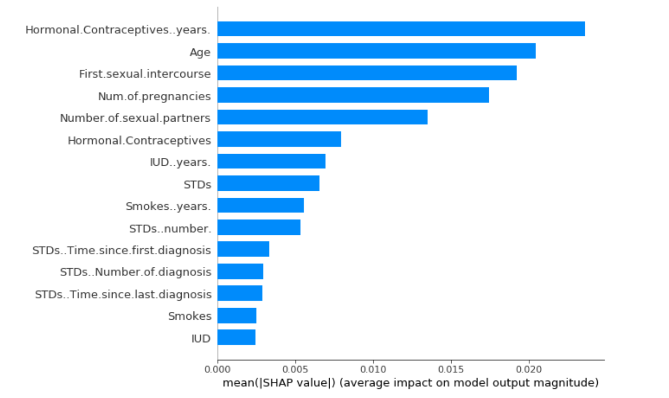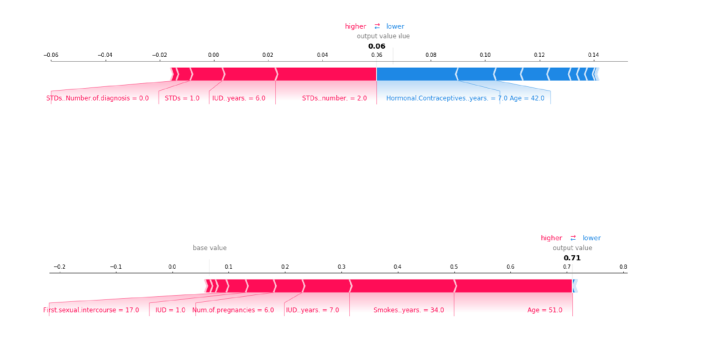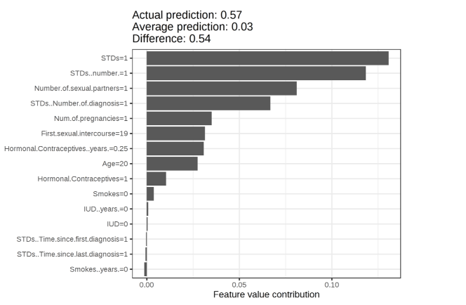 宫颈癌数据集中⼀名⼥性的 Shapley 值。预测为 0.57,也就是比平均概率大 0.54