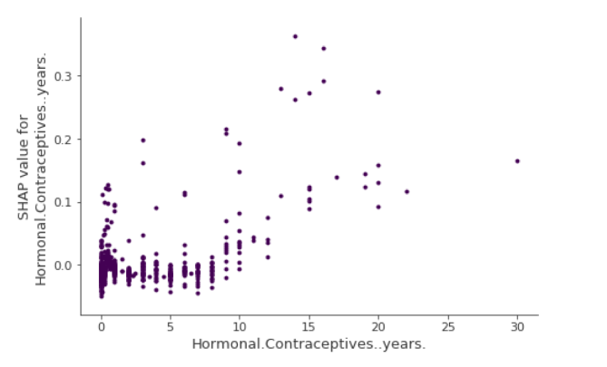 SHAP 依赖图是部分依赖图和累积局部效应图的替代⽅法,不是对平均而是对全局效应的评估。SHAP在$y$轴上的分散往往暗示交互效应的存在